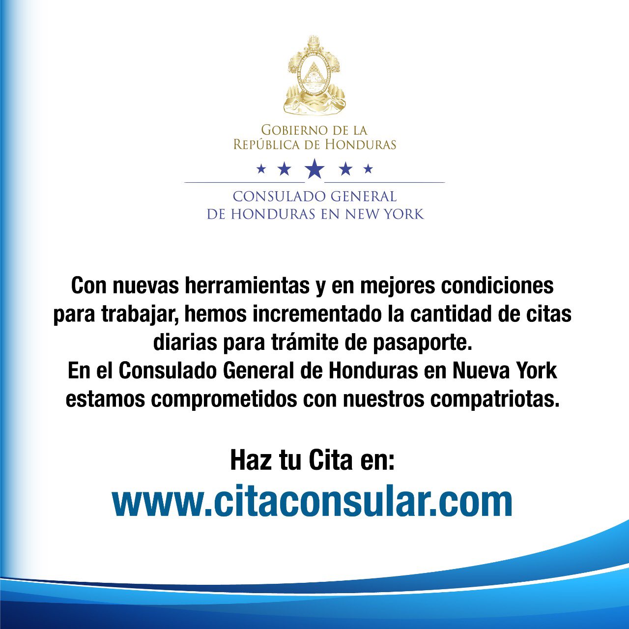 Consulado de Honduras Nueva York NY. La cita para la solicitud de pasaporte se realizará vía Internet en el Consulado de Honduras en Nueva York. La plataforma de citas en los Consulados hondureños se desarrolló con el propósito de gestionar todos los trámites por medio de un control y un orden lo que permite que cada una de las. Correo electrónico del Consulado Hondureño en New York.